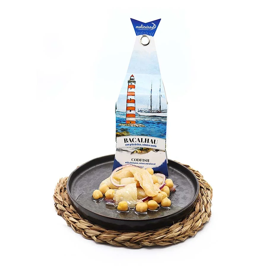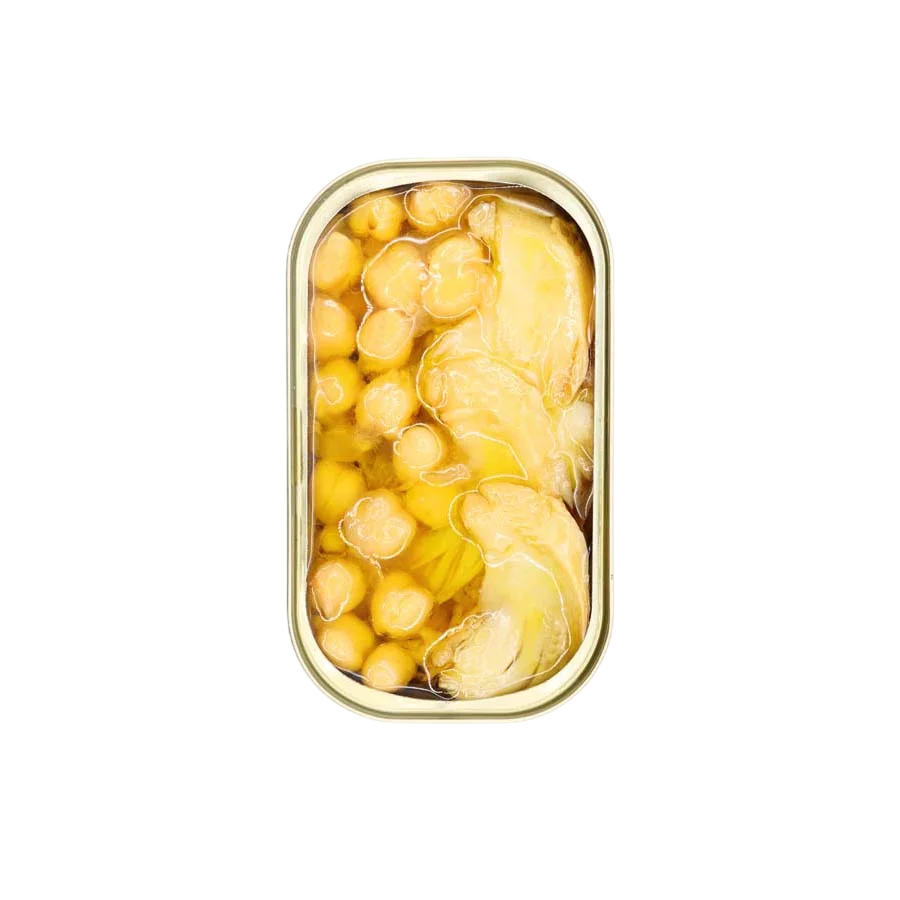 It features selected Cod, first soaked to remove excess salt and then cooked. Once ready, it is flaked and hand-packed into tins, with a portion of chickpeas and onion added, and finally generously covered in olive oil.