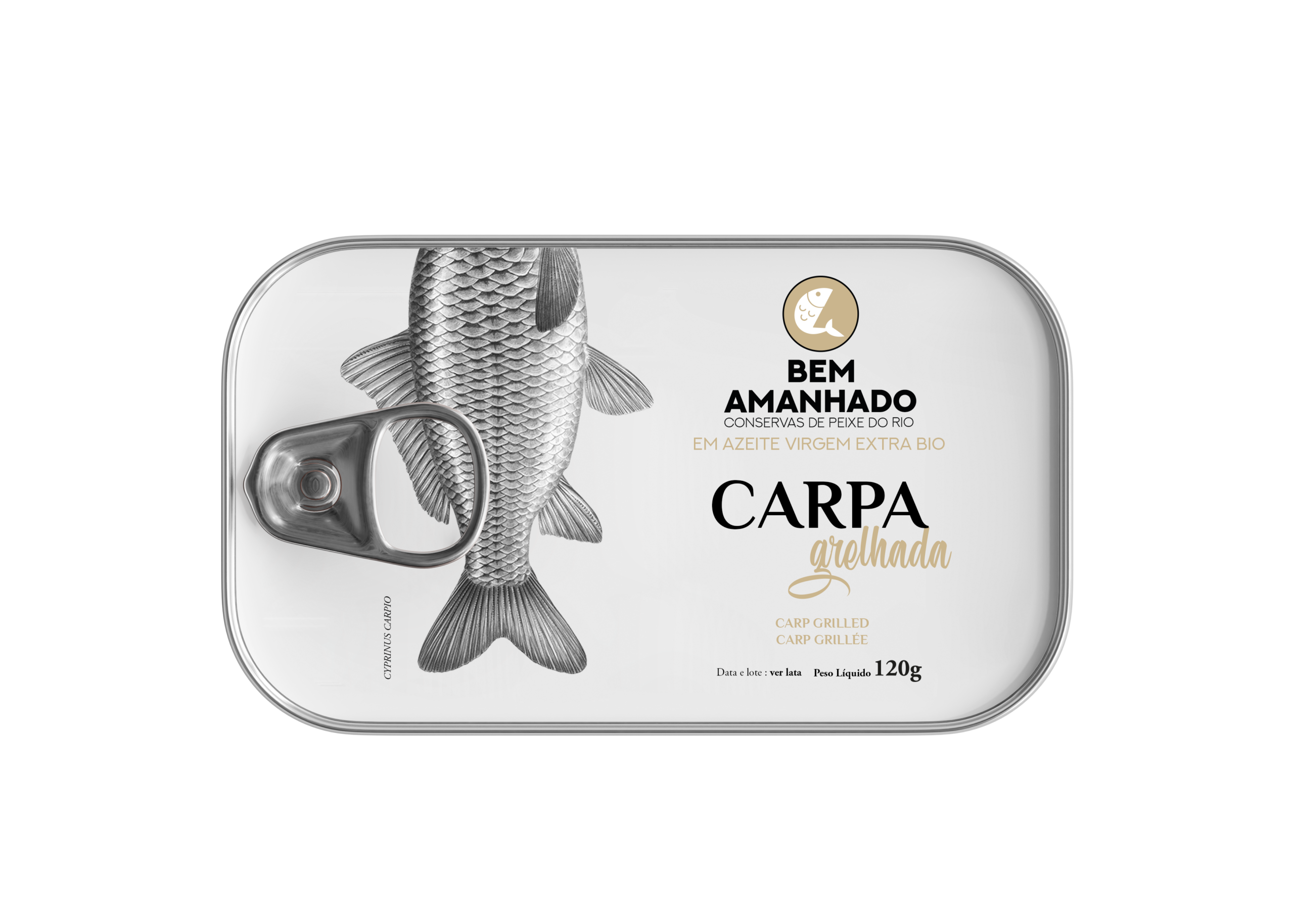 Carp (65%); organic extra virgin olive oil; garlic; coriander and salt. (Certified by PT-BIO-02). Allergens: contains fish – May contain bones Net weight: 120 g – Wild fish of UE origin