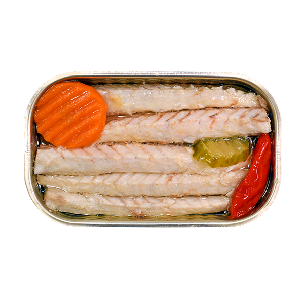 Mackerel (min. 70.8%), refined olive oil (23.3%), pickles (carrot – 2.5%; cucumber – 1.7%), piri piri (1.7%) and salt.